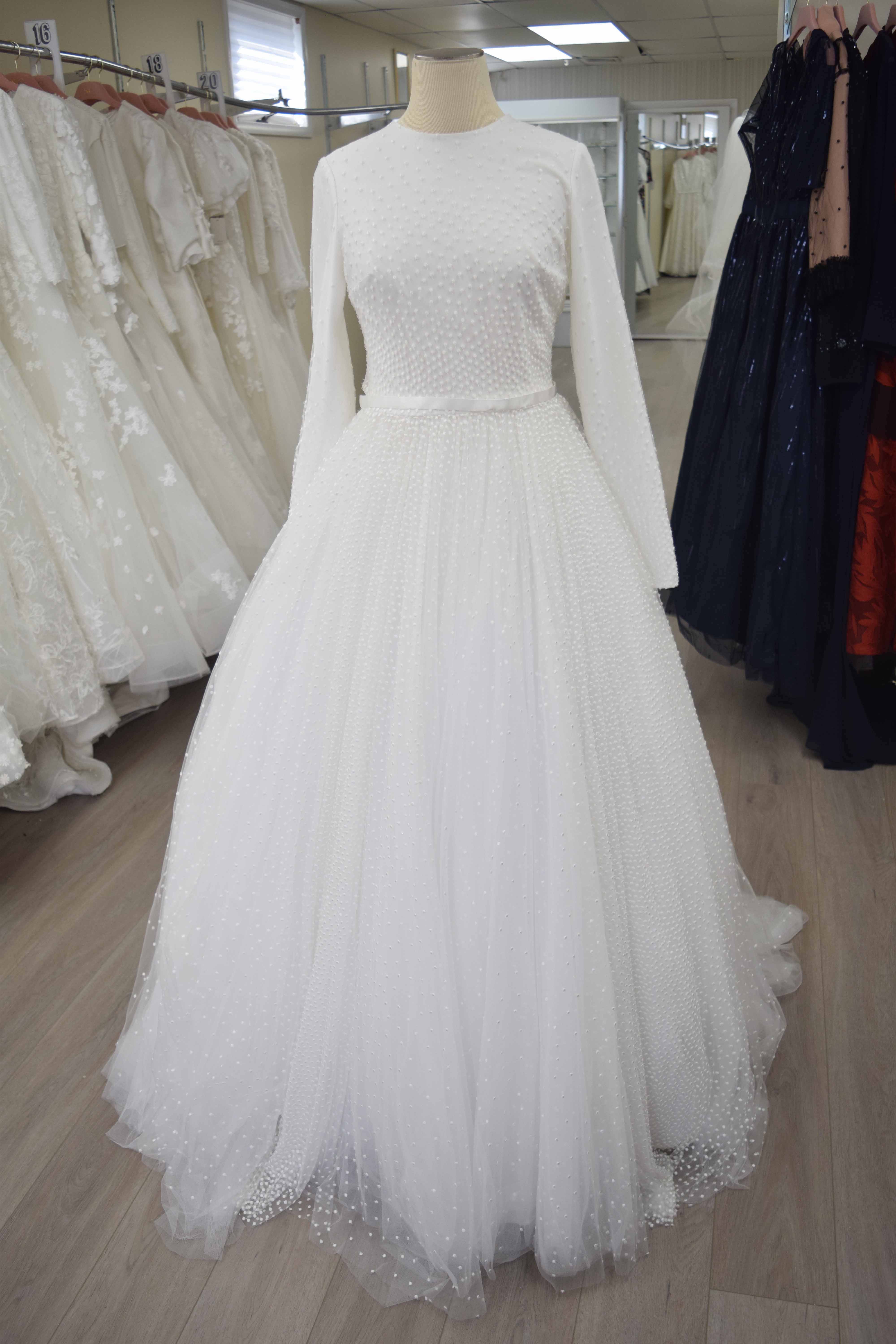 White full Swiss dot with pearl buttons down back