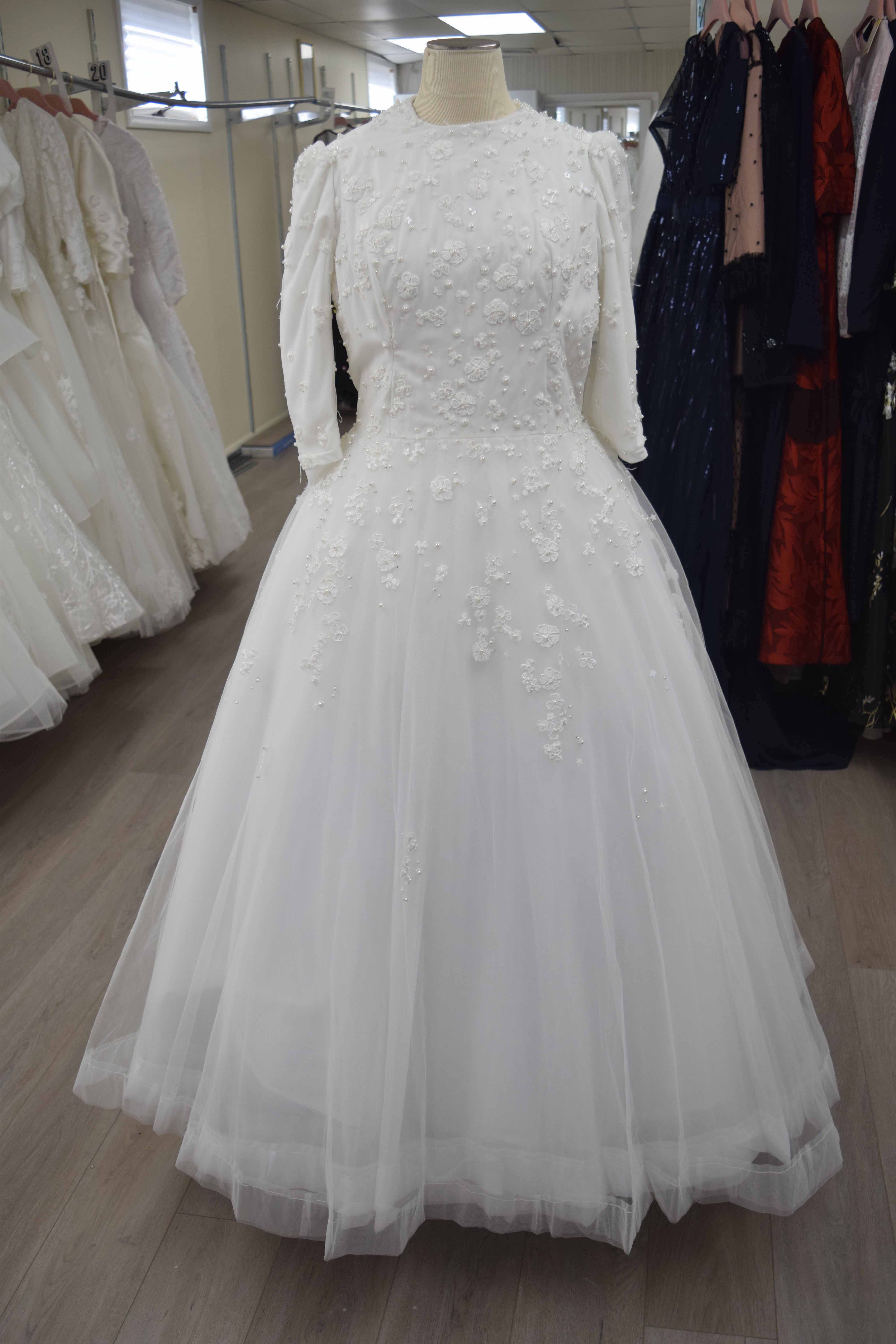 Tulle skirt with flowers and pearls on top with a little on bottom