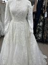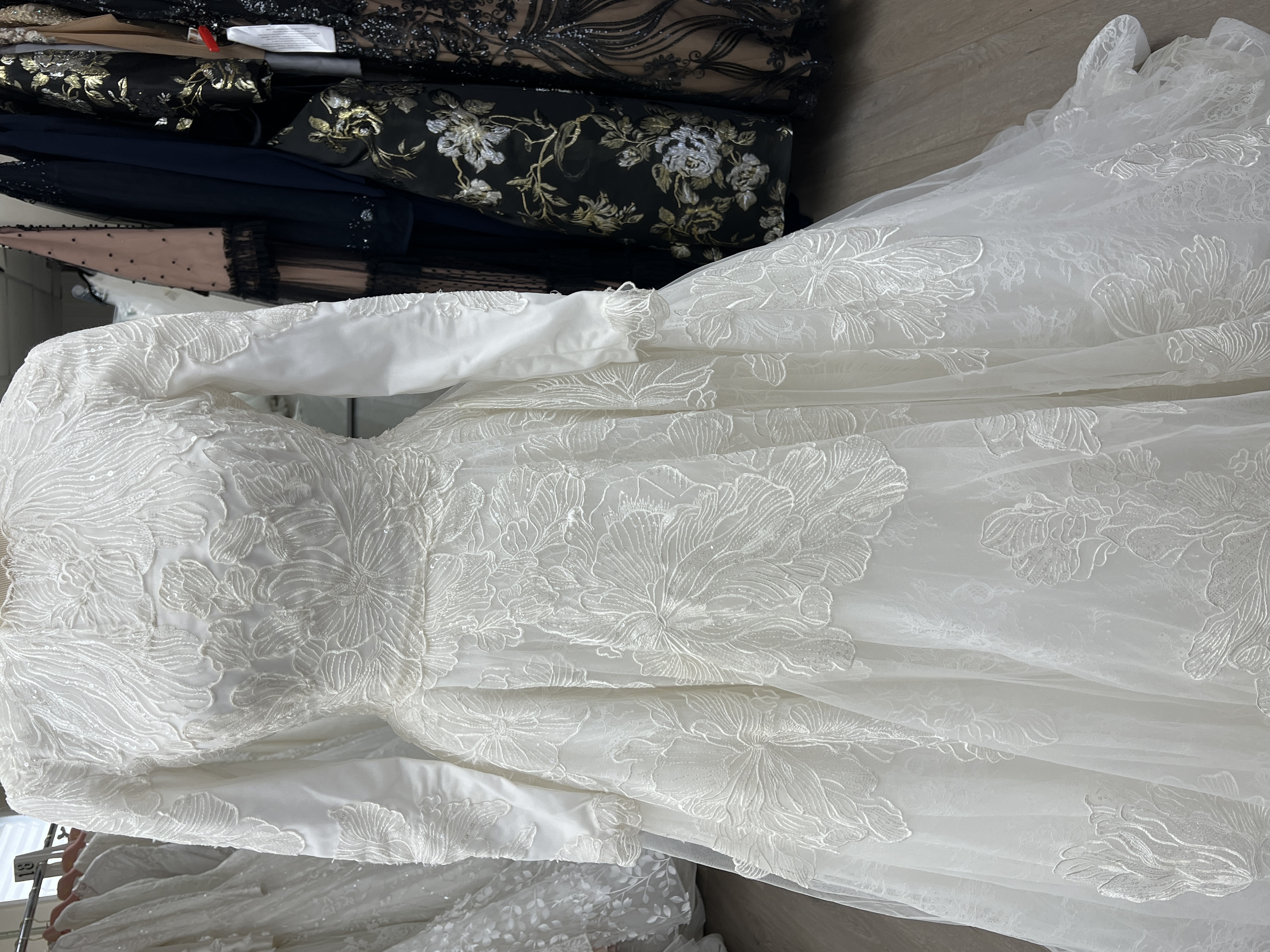 Full skirt lace under layer with big embroidered flowers on tulle and sequins over. Train attached. Donated