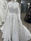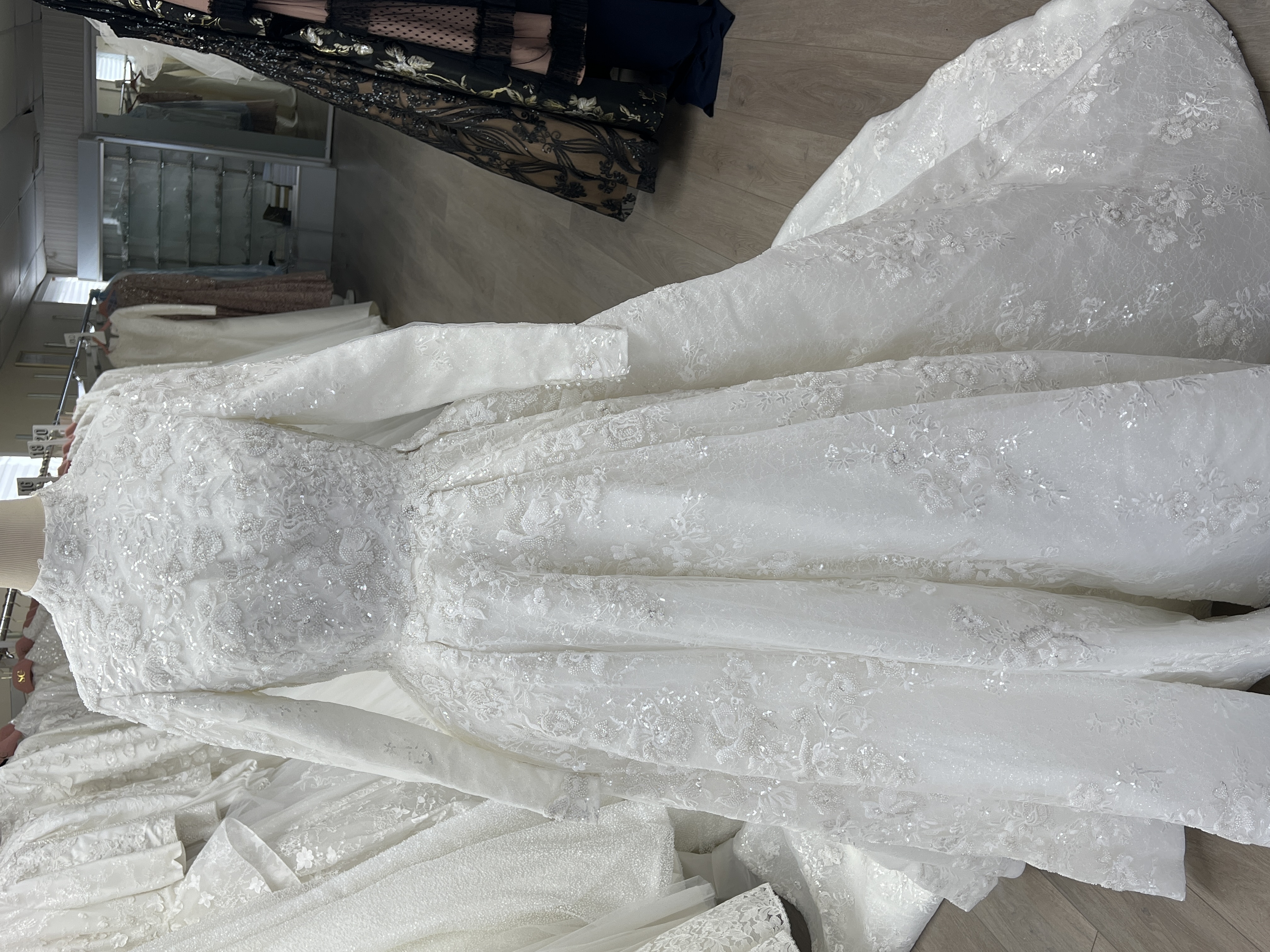 Ball gown skirt lace layer underneath with glitter and pearl and silver sequin floral design. Detachable train