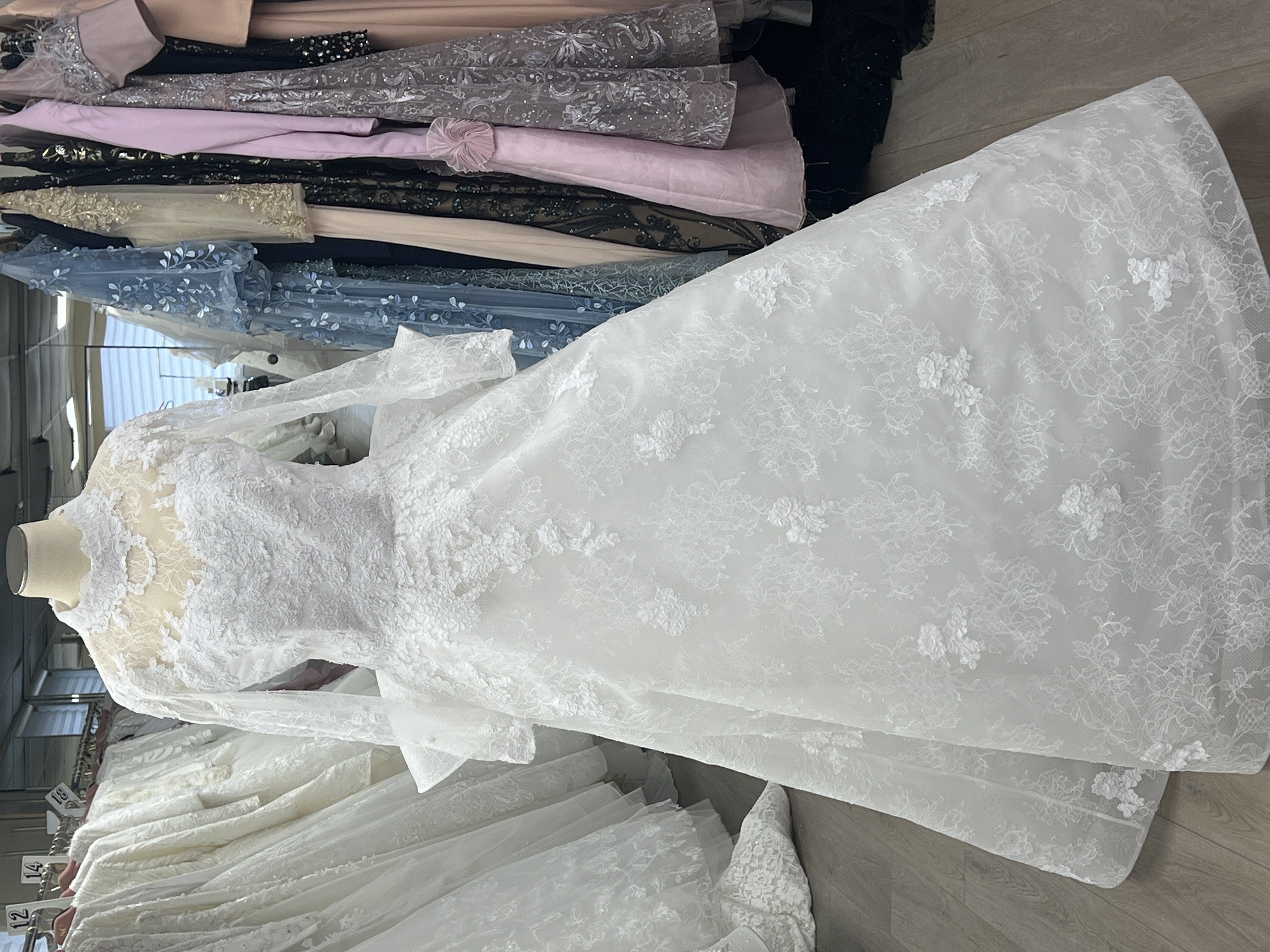 A-line lace wedding gown with back peplum