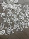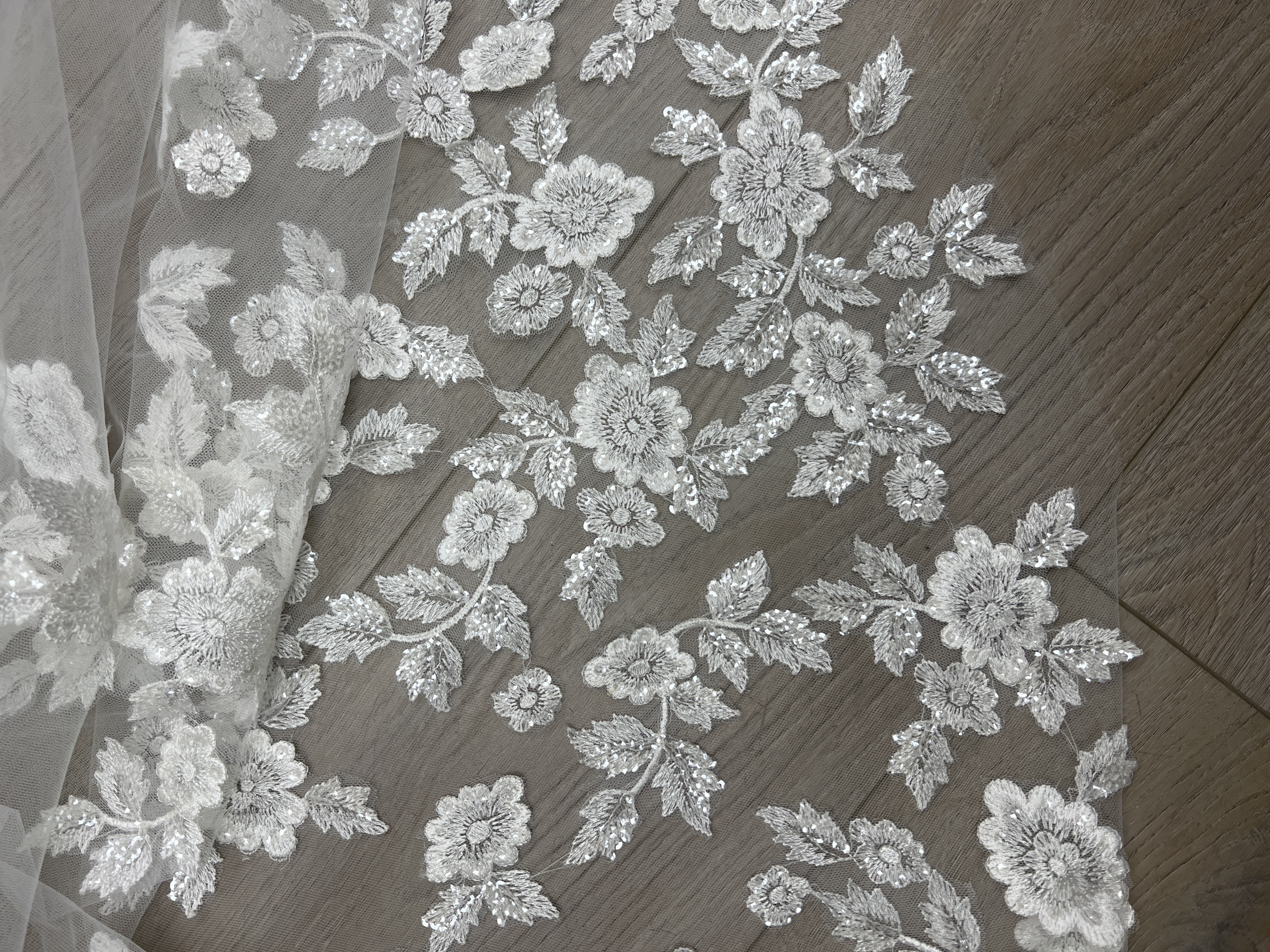 White tulle one layer with sequin floral designs scattered around edge and all around bottom