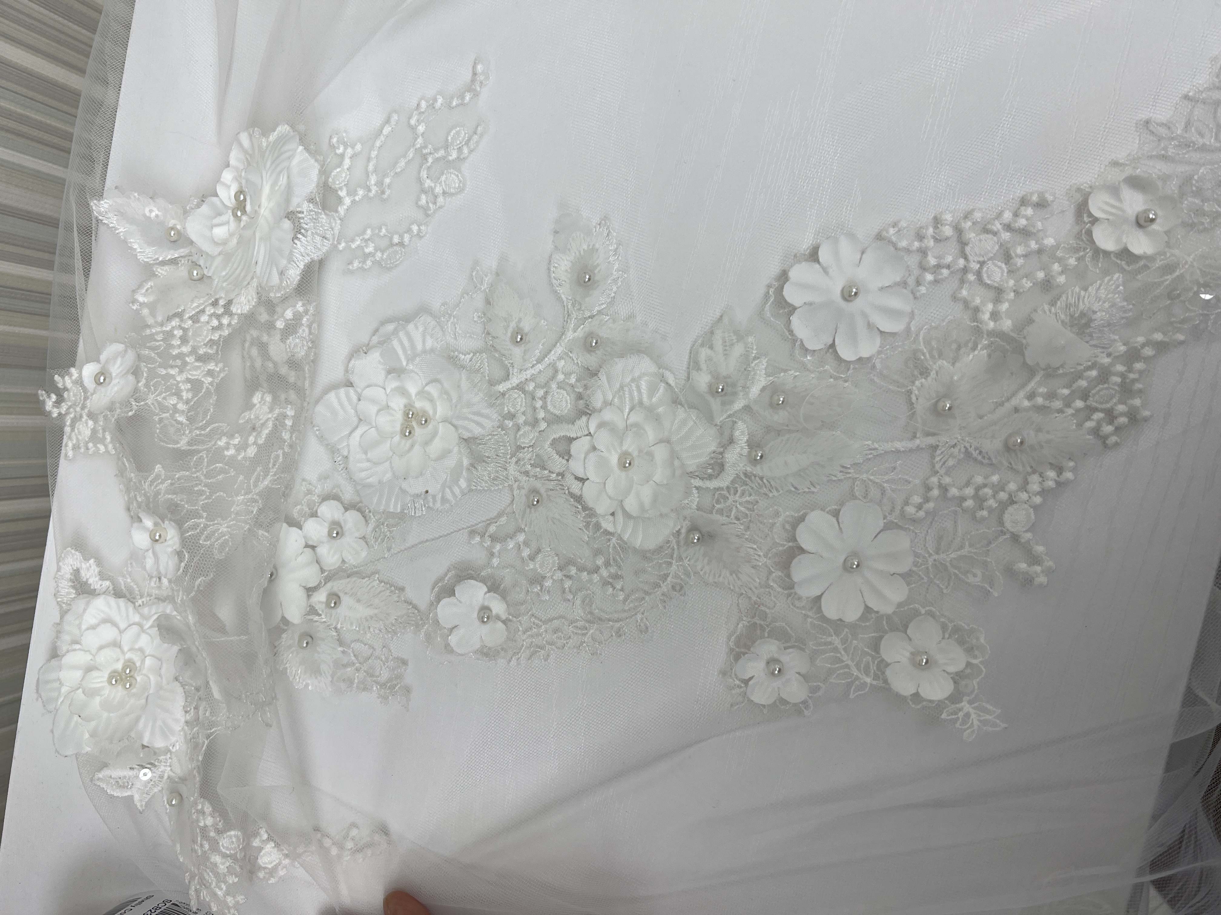 Extra long veil with 3D flowers and appliqués all over. Blusher attached