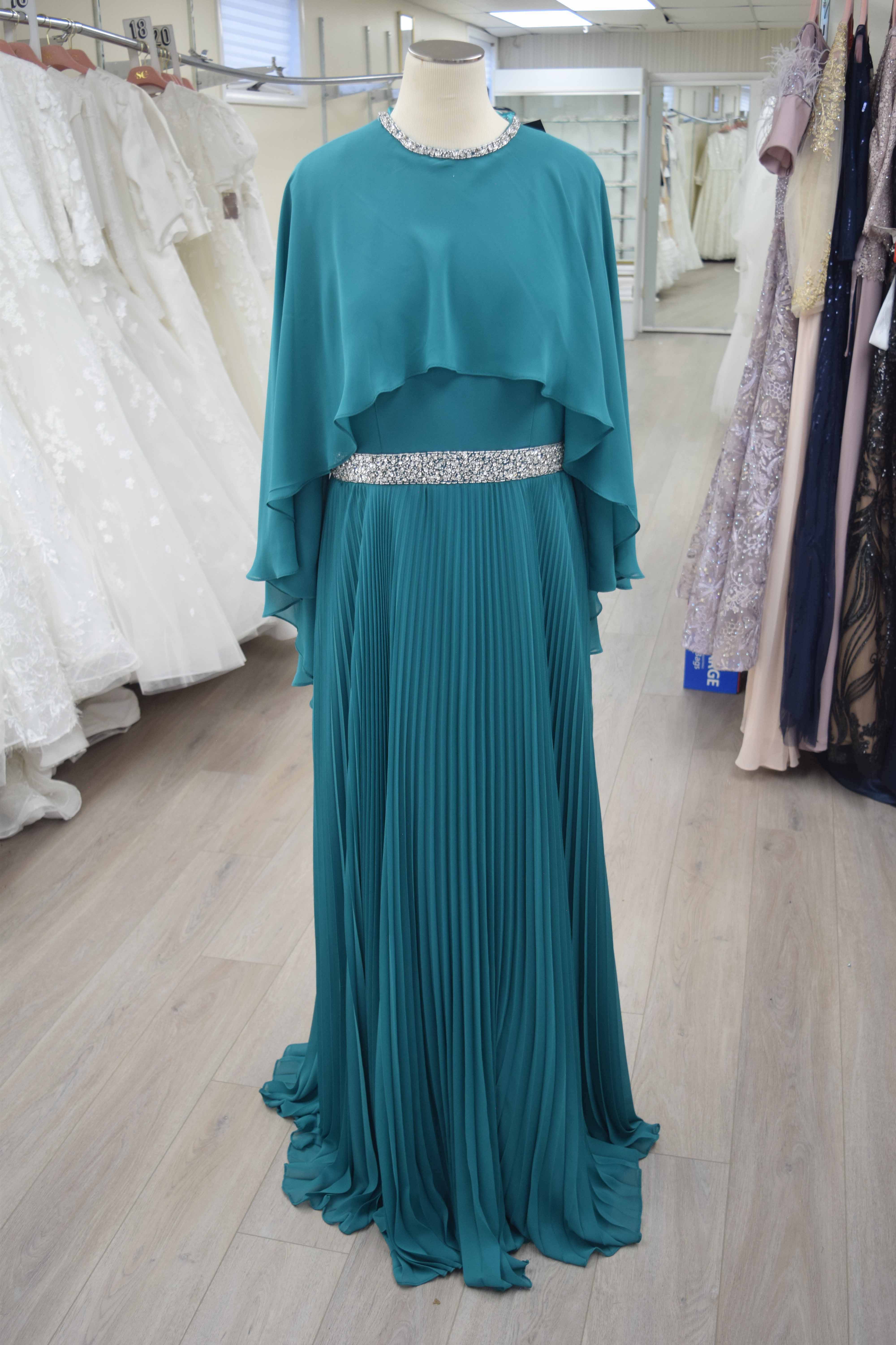 Aqua green chiffon pleated silver beaded waist and neckline with capelet