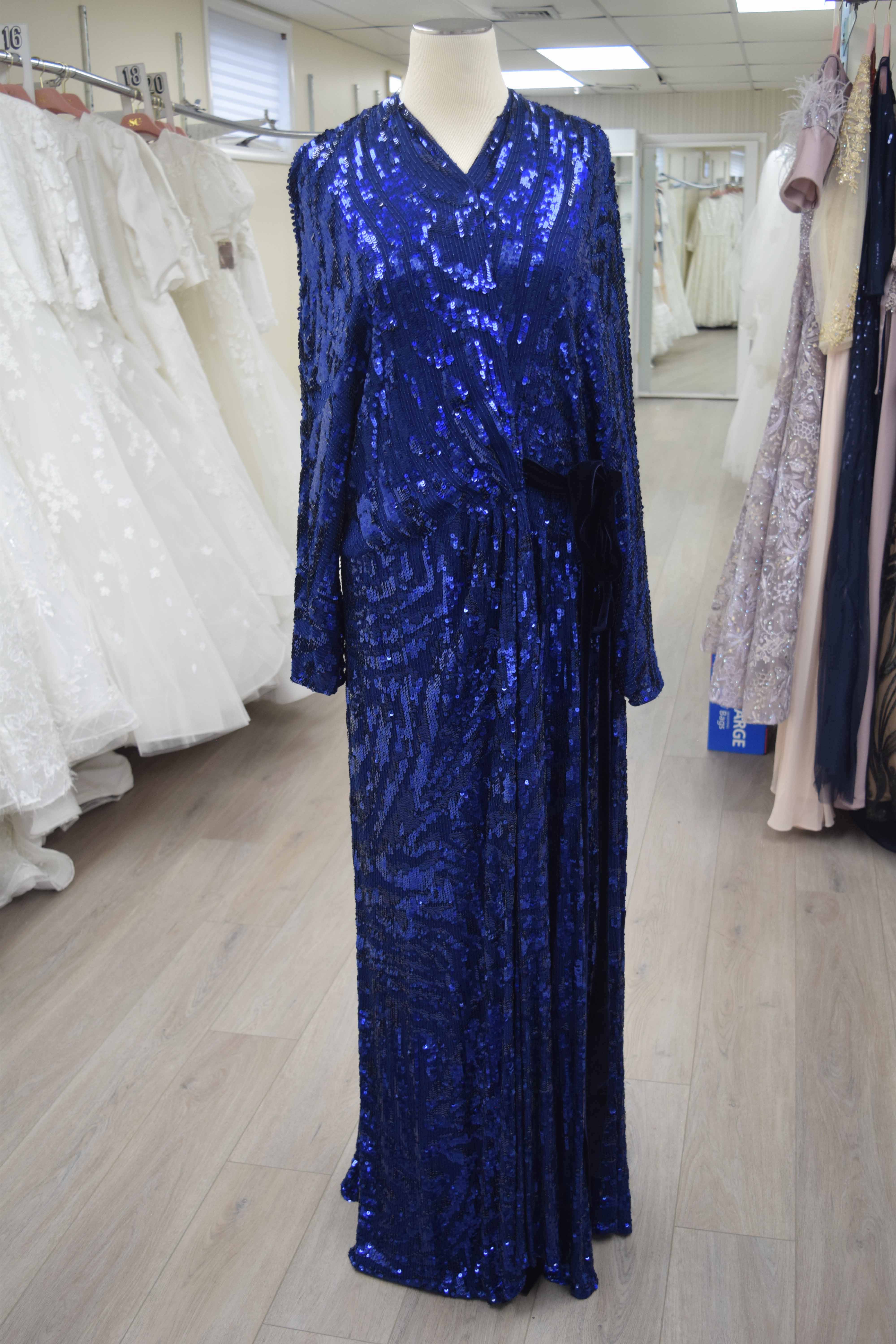 Blue sequin wrap dress with navy velvet tie