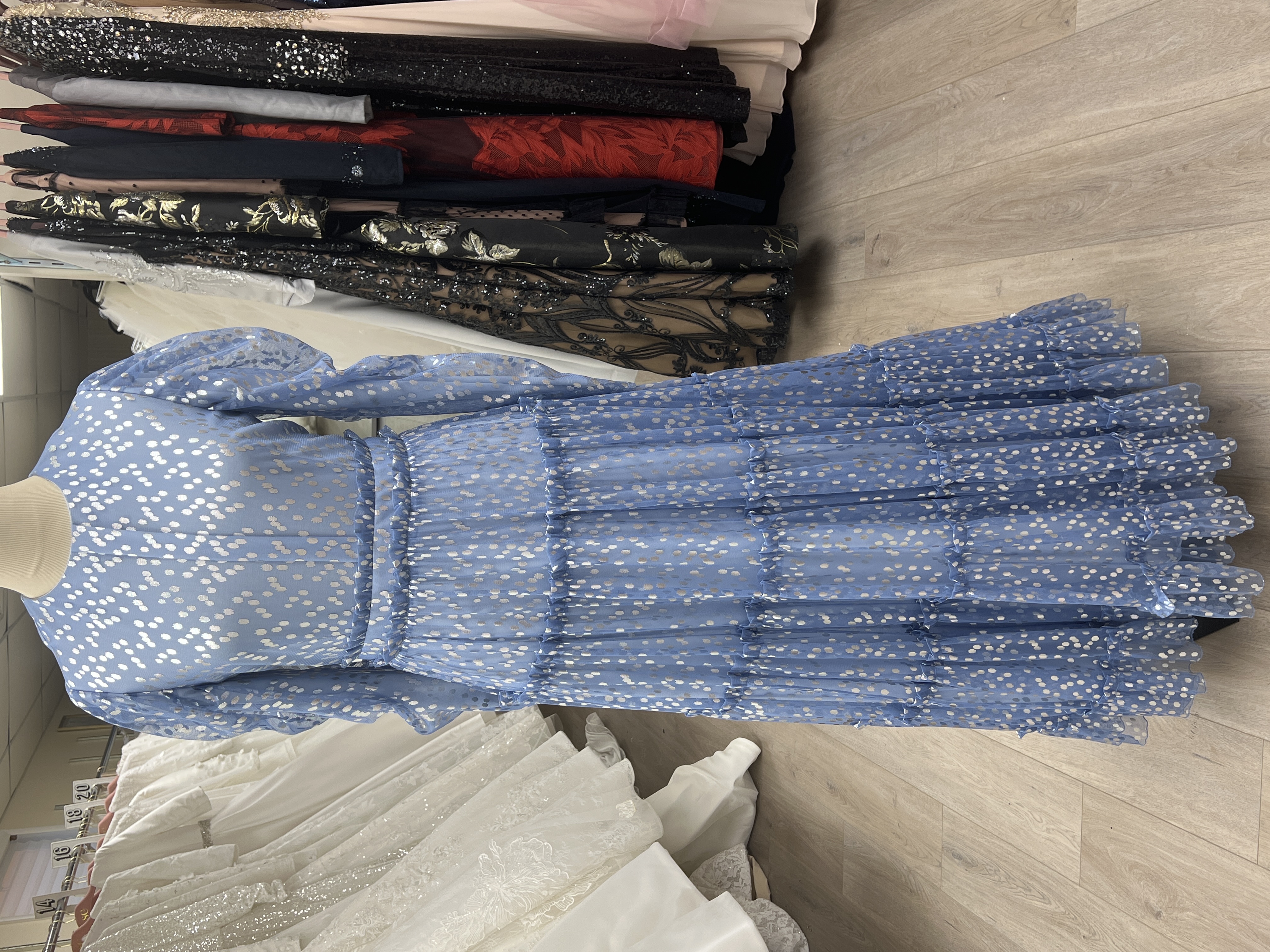 Light blue layered bottom with silver polka dots and puff sleeve