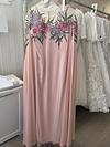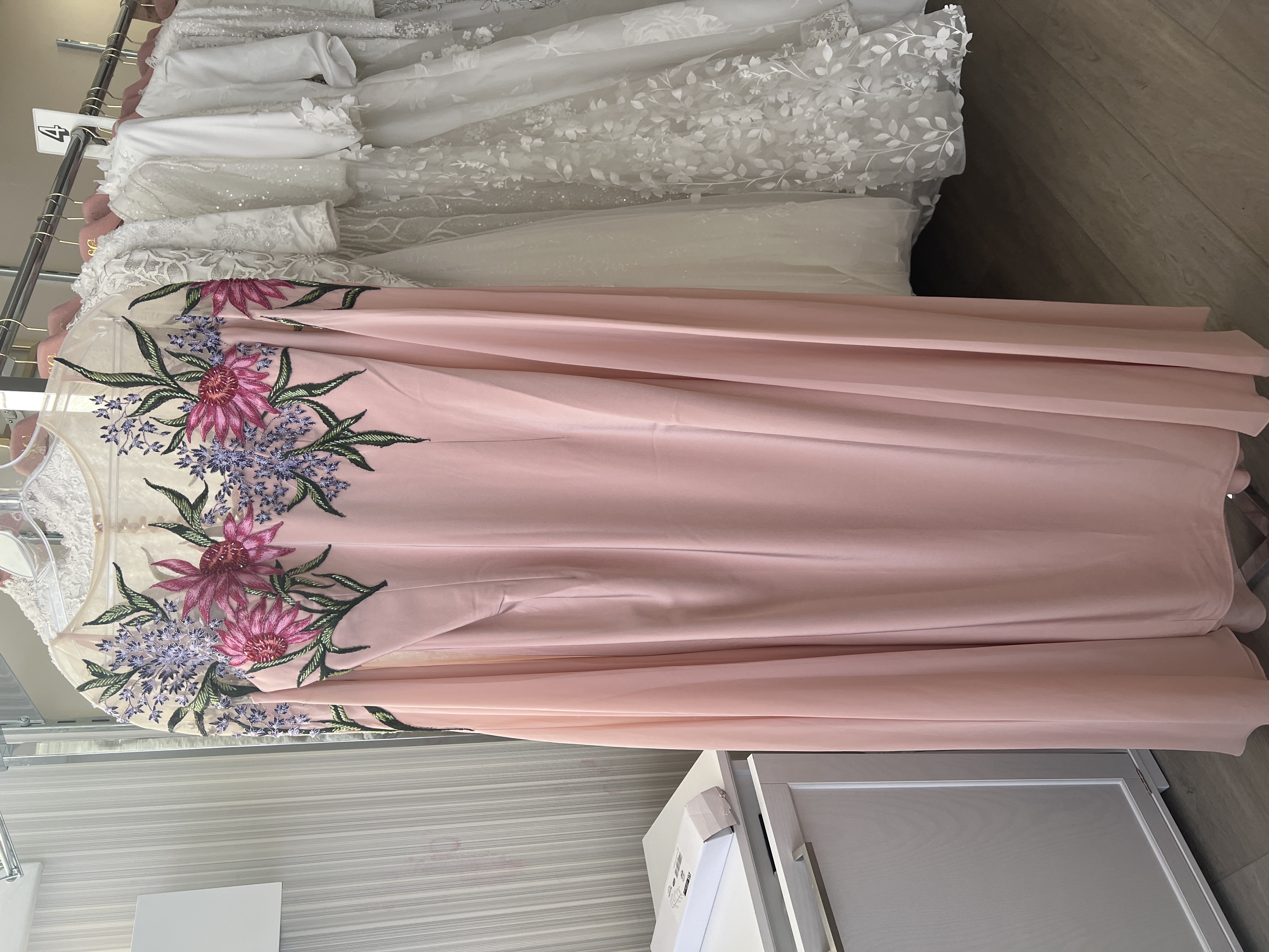 Straight pink with pink and green floral design on neckline and shoulder and organza long cape attached
