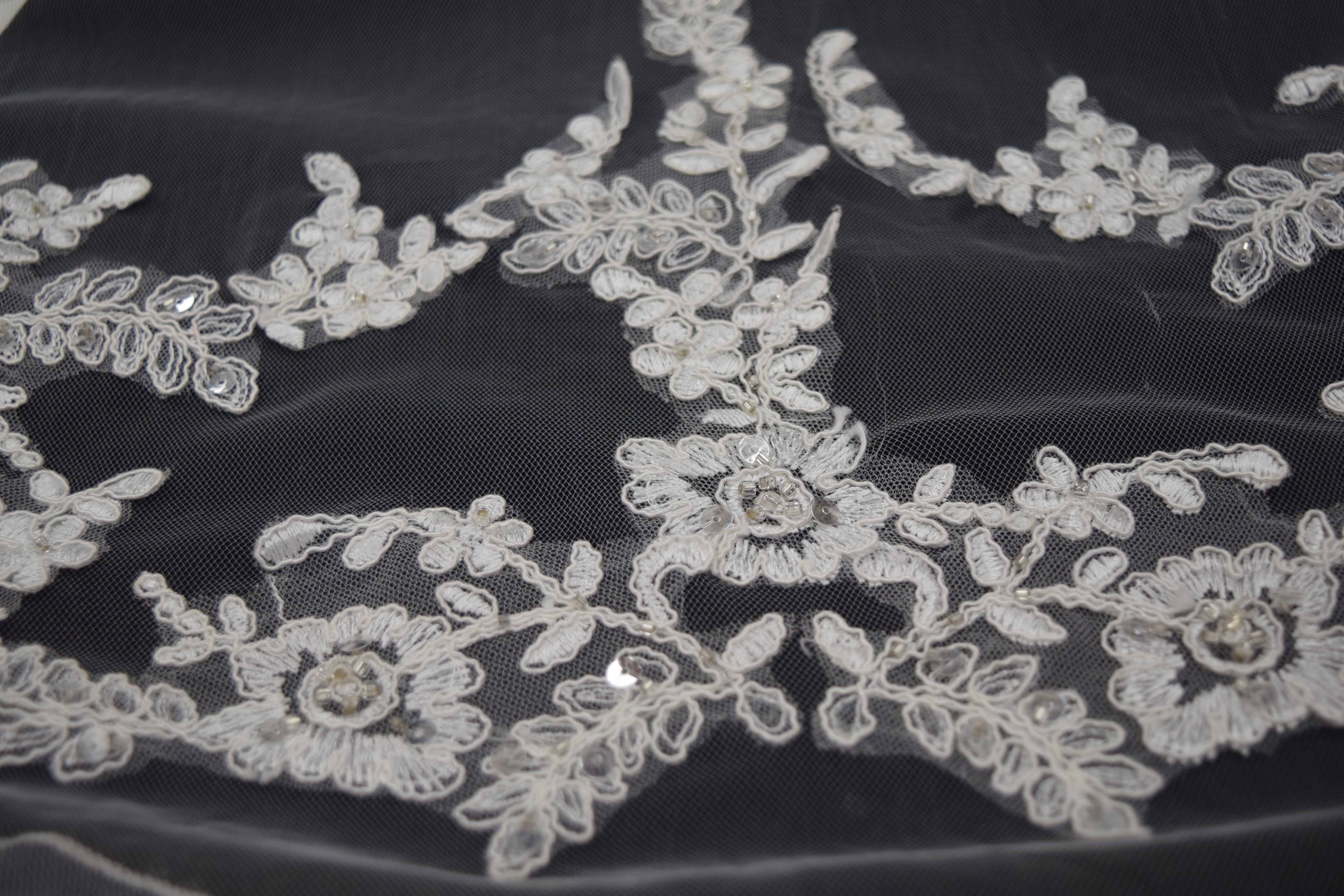 Single layer with lace appliqué and silver beading at the bottom