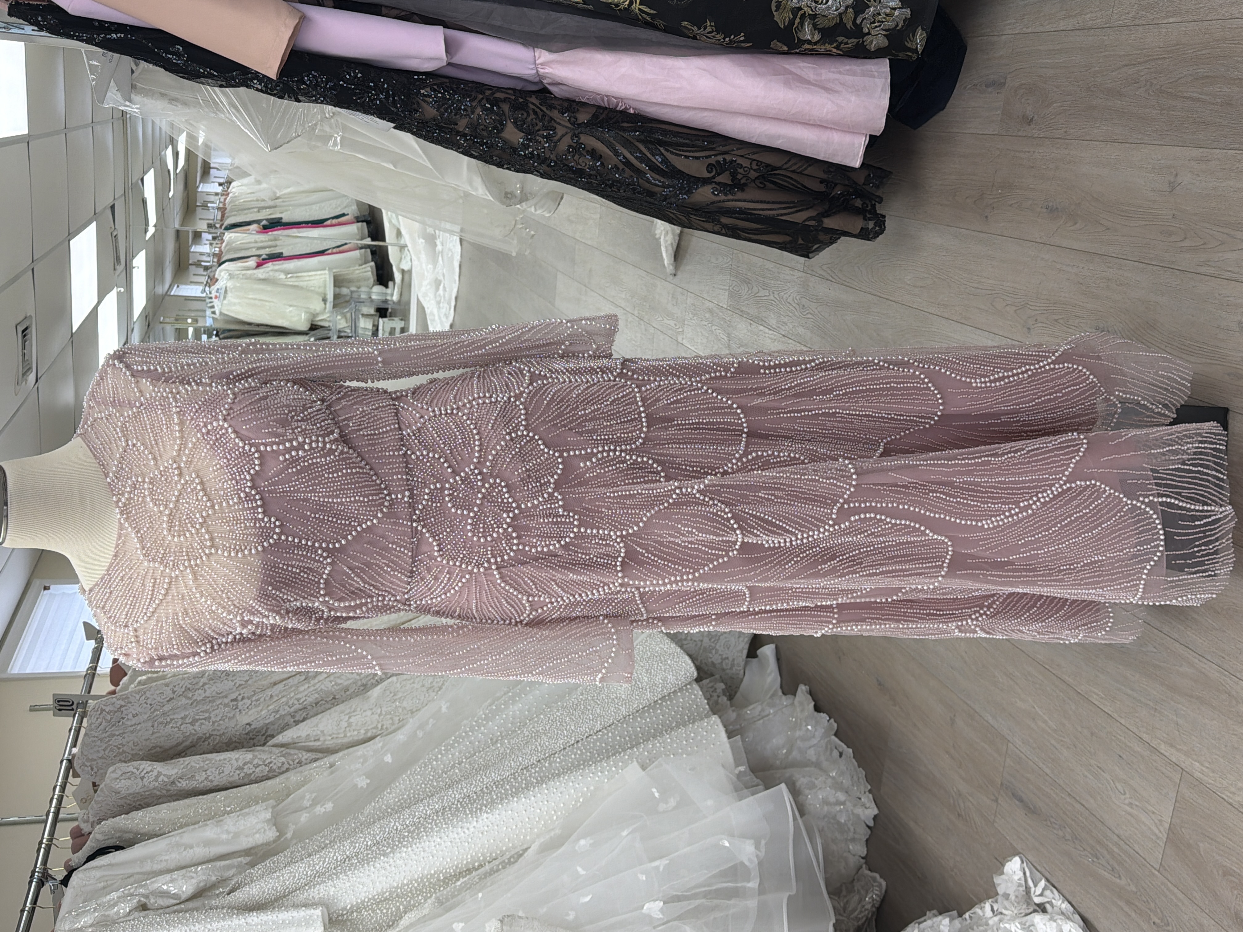 A-line dusty pink with design in pearls in floral design