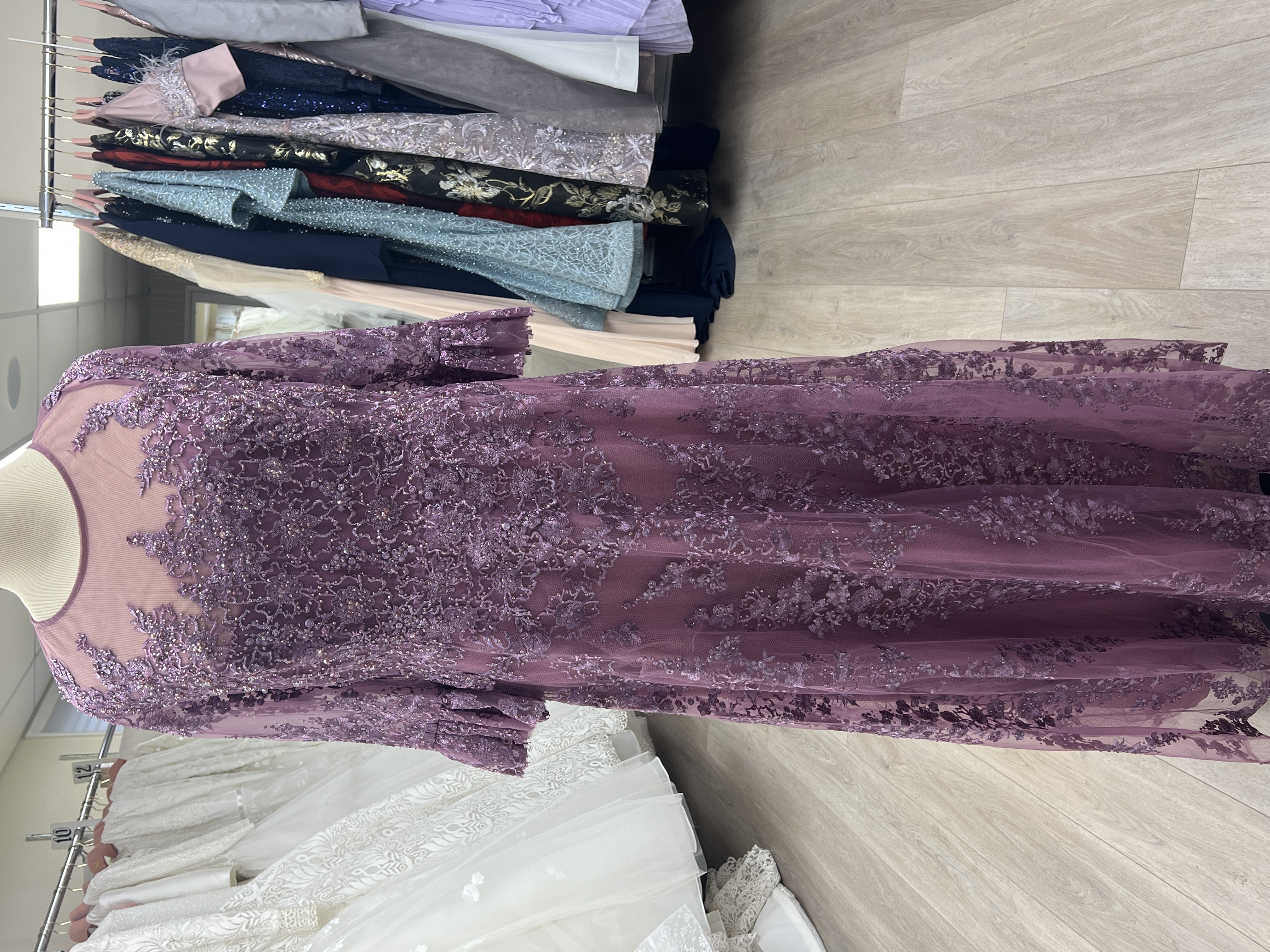 A-line purple berry color tulle with beaded lace. 3/4 sleeve with ruffle cuff