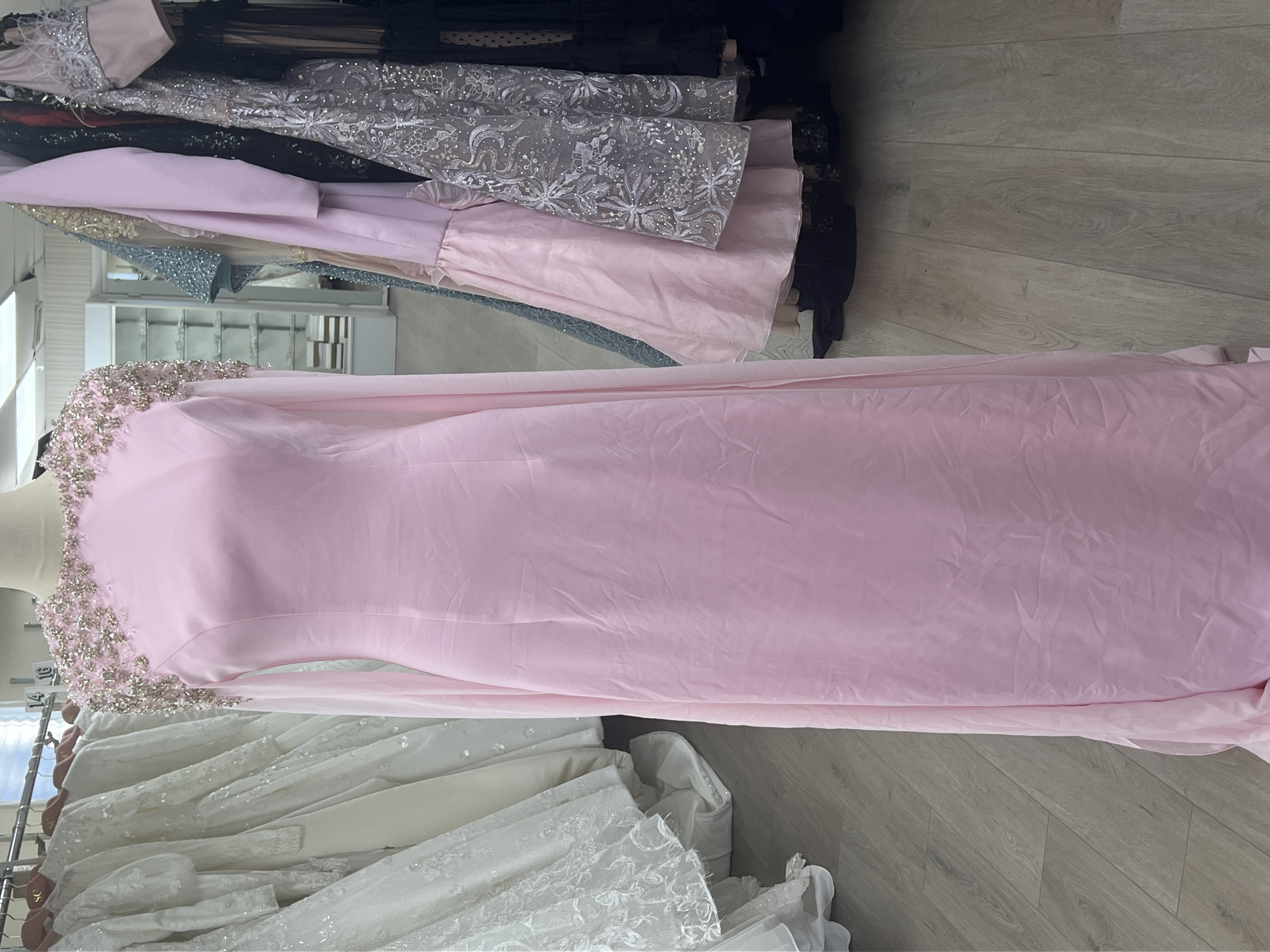 Pink straight crepe beaded shoulders and chiffon long sleeve