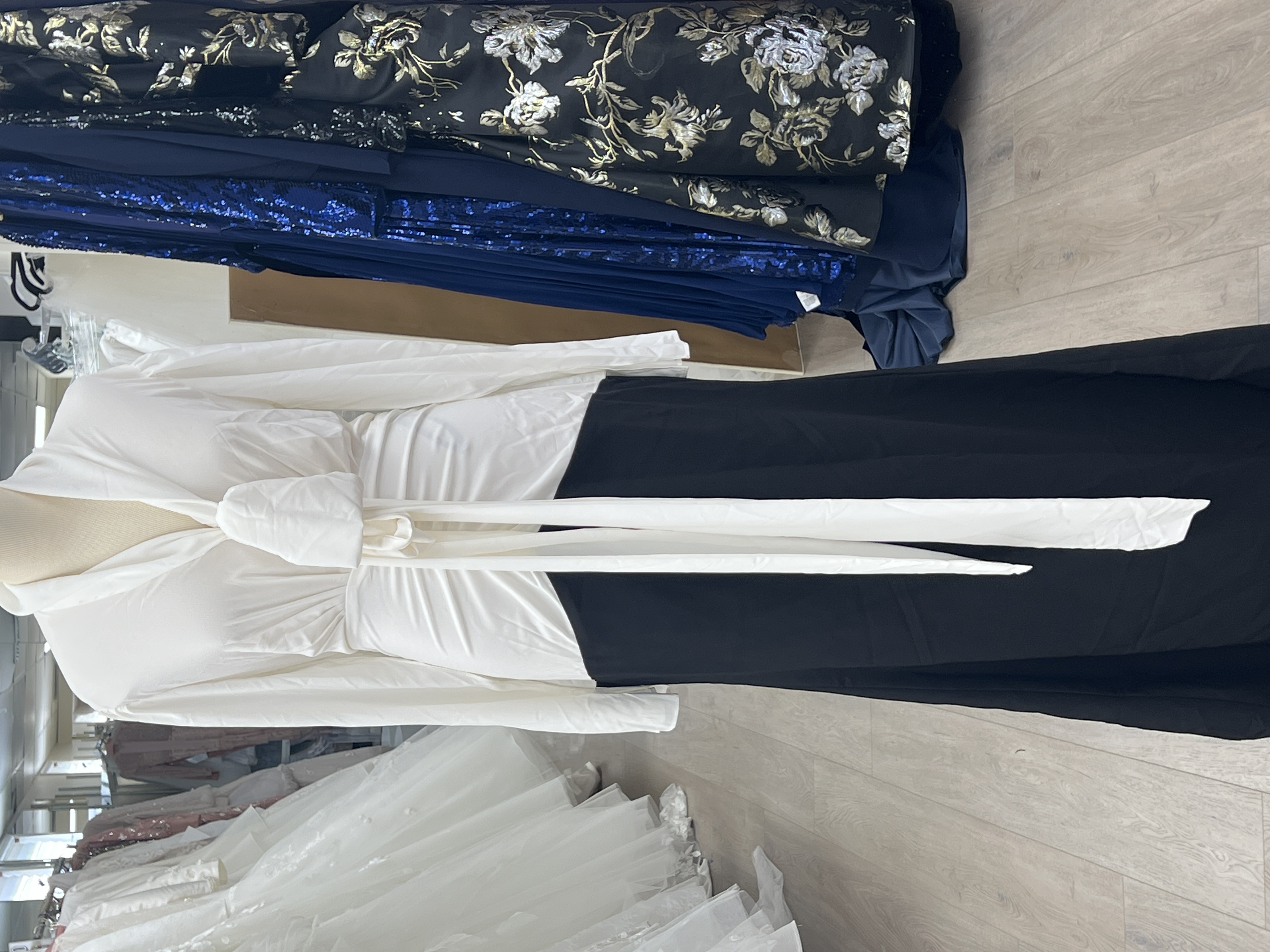 Black mermaid skirt with white blouse style top long tie at neck and long in back