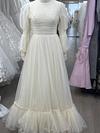 Cream tulle a-line gown, peasant style, ruffle at bottom of skirt and puff sleeves