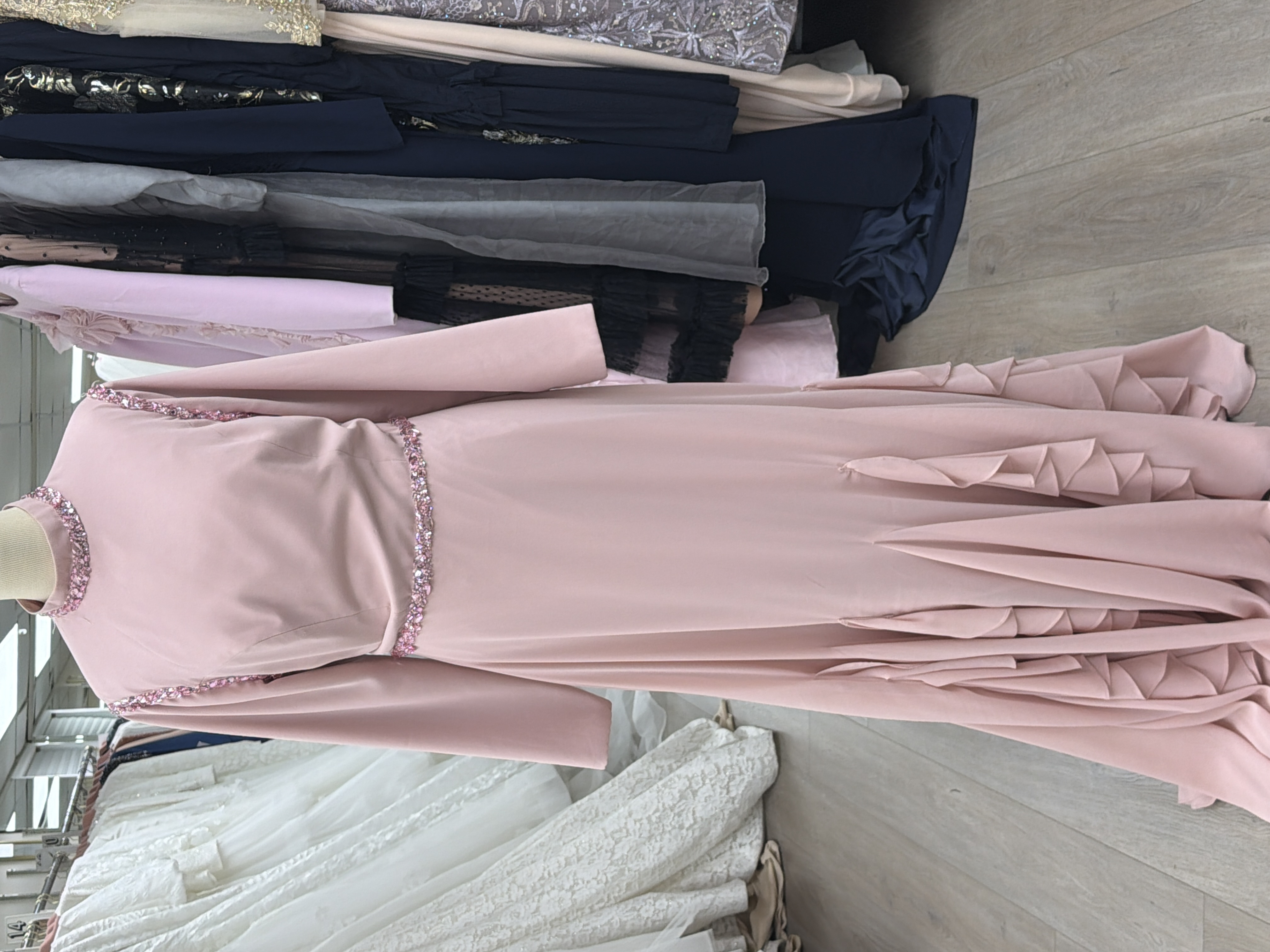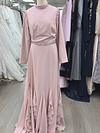 Mauve pink straight with ruffle bottom and pink jewels around neck shoulder and waist