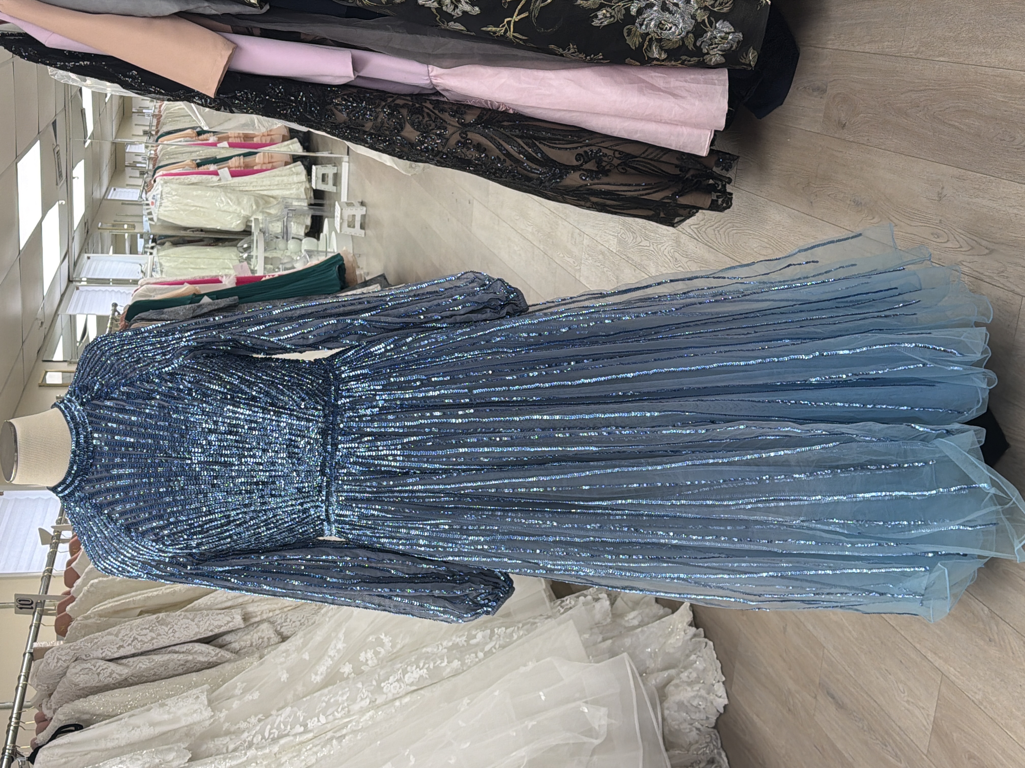 Blue tulle gown with ice blue sequins going down and full sleeve at cuff. A-line