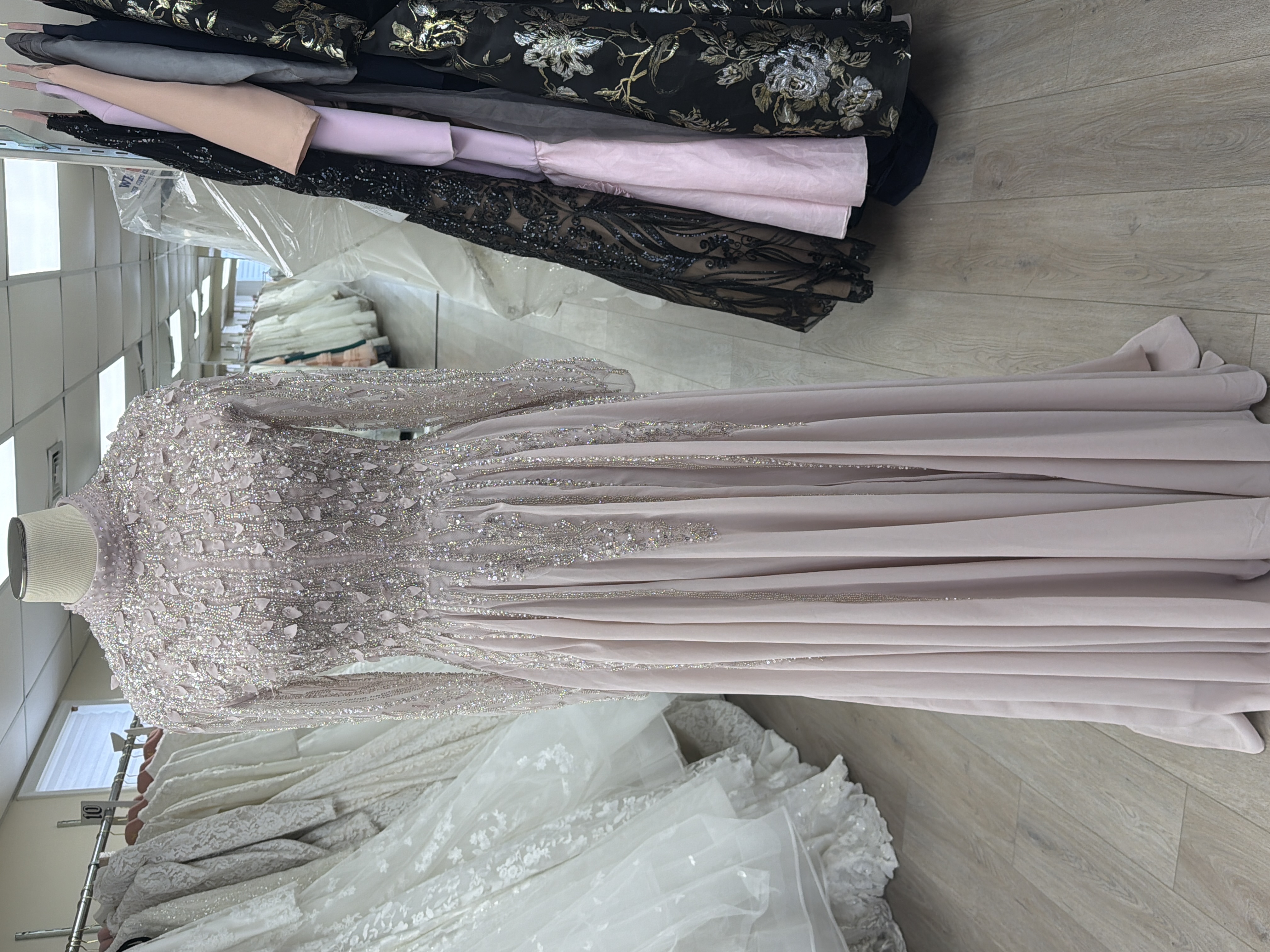 Mauve pink chiffon gown with 3-D petals and silvery beading going down. Hugh waisted high neckline - Grecian looking
